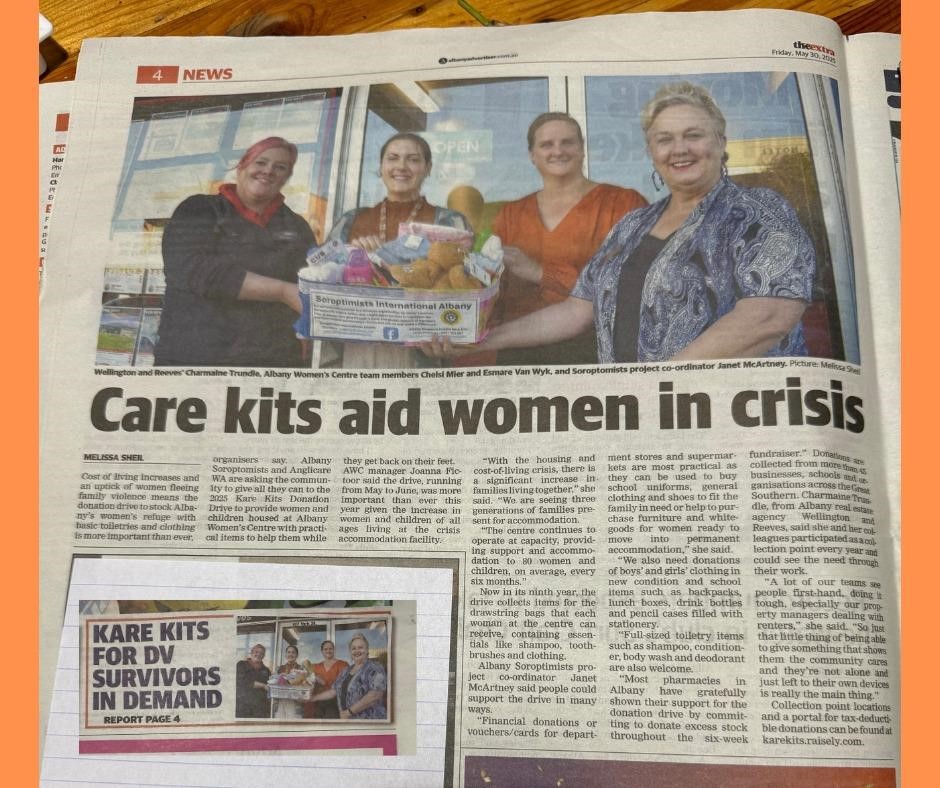 AWC staff worked with SI members to assemble the kits and AWC staff took all the kits as well as the all the extra items donated. These included tissues, children's and women's clothing, travel toiletry kits, bath packs, facial care masks, hand/nail/foot care items, hair ties, lip balm, make up, baby items, blankets, shower caps and commercial pamper packs were among the donation. SI Albany members distributed the boxes and collected when full and assembled the kits at an SI members home. AWCKK, SI Albany and Anglicare Facebook pages continue to engage and advertise the drive, with posters promoting the participating entities involvement at box drop off and collection. These Facebook pages also disseminate information about prevention of family violence and helplines. Regularly throughout the year people contact the page to give donations.  Soroptimists will pick up and deliver to Anglicare or the AWC. Those items not needed by the Albany Women's Centre were donated to Days for Girls (travel size soap), and Shalom House shelter for homeless men (men's toiletries and clothes). This year $1310 was raised through cash donation and direct bank transfer to the Kare Kits account held by Anglicare. $300 worth of local store vouchers was donated.