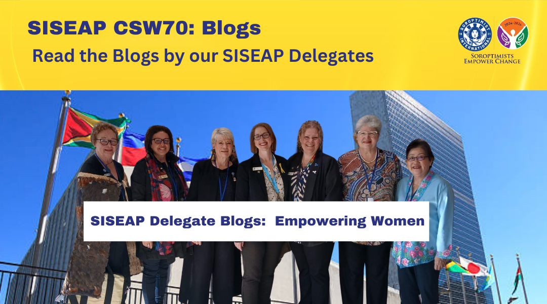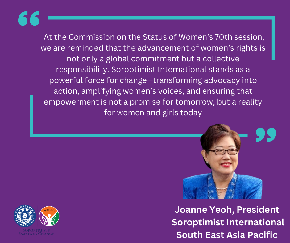 SISEAP President Joanne Yeoh, statement on the importance of Sorotpimist International South East Asia Pacific attending CSW 70 in person. Of our collective responsibility to be a global voice for all women.